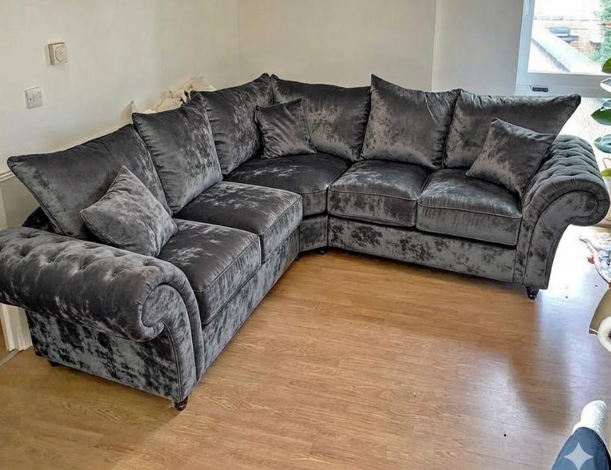 The NICOLE 5-Seater Corner in Crush Velvet is the ultimate high-fashion centerpiece designed for the heart of a glamorous UK home. Measuring 217cm x 217cm, this symmetrical corner unit offers a perfectly balanced layout that captures and reflects light from every angle. It is the premier choice for families who want maximum seating capacity paired with a dramatic, shimmering aesthetic that makes the living room feel like a luxury boutique.