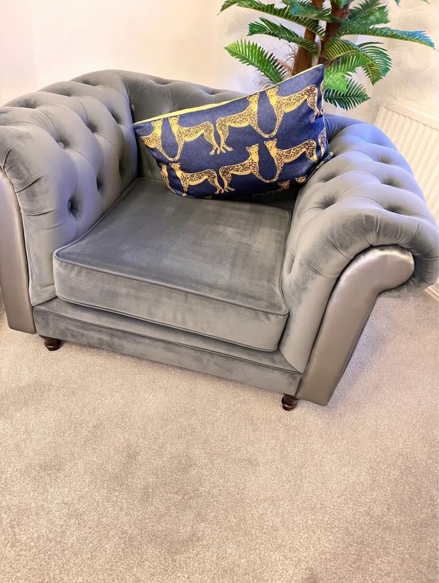 The OLYMPIA CHESTERFIELD 1 Seater Plush Velvet Dark Grey Sofa is the definitive statement of luxury for the modern home. This armchair takes the world-renowned British Chesterfield silhouette—featuring its signature deep-buttoned back and rolled arms—and elevates it with the most sought-after fabric in interior design.