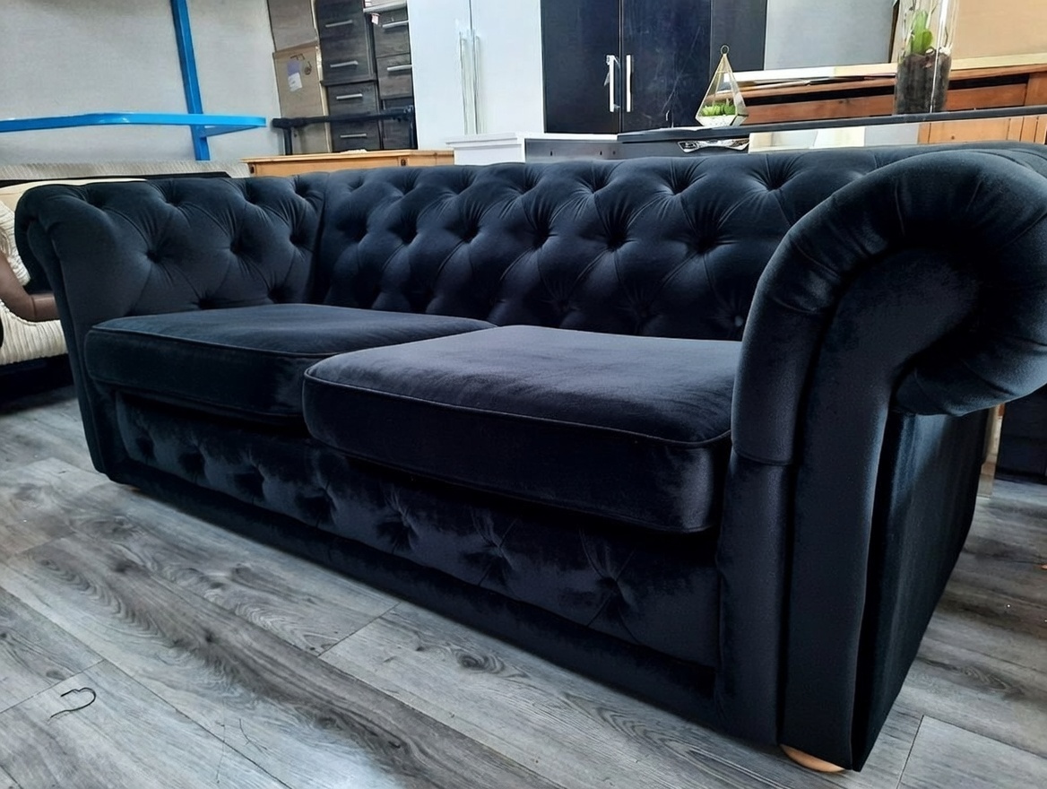 The OLYMPIA CHESTERFIELD 3 Seater Plush Velvet Dark Grey Sofa is the ultimate expression of grand-scale luxury. This spacious sofa scales up the iconic British Chesterfield silhouette—featuring its signature hand-buttoned back and rolled arms—to provide a prestigious seating solution for three adults.